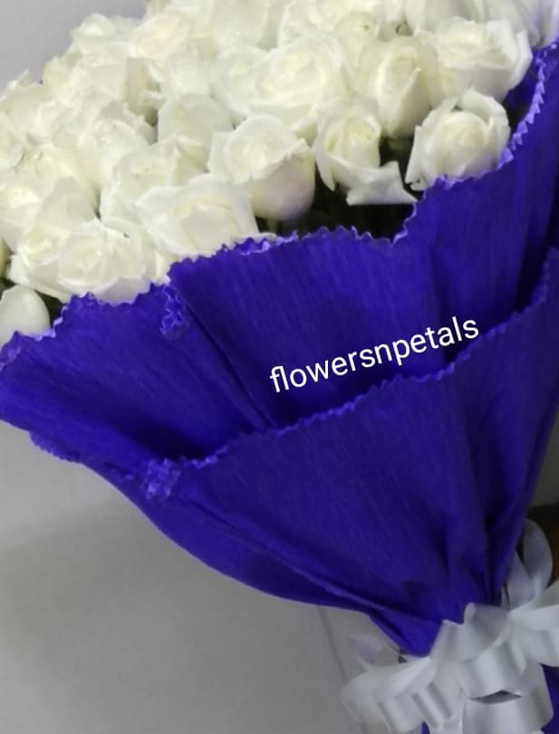 50 White Roses Bunch With 2 layer Blue Paper Packing