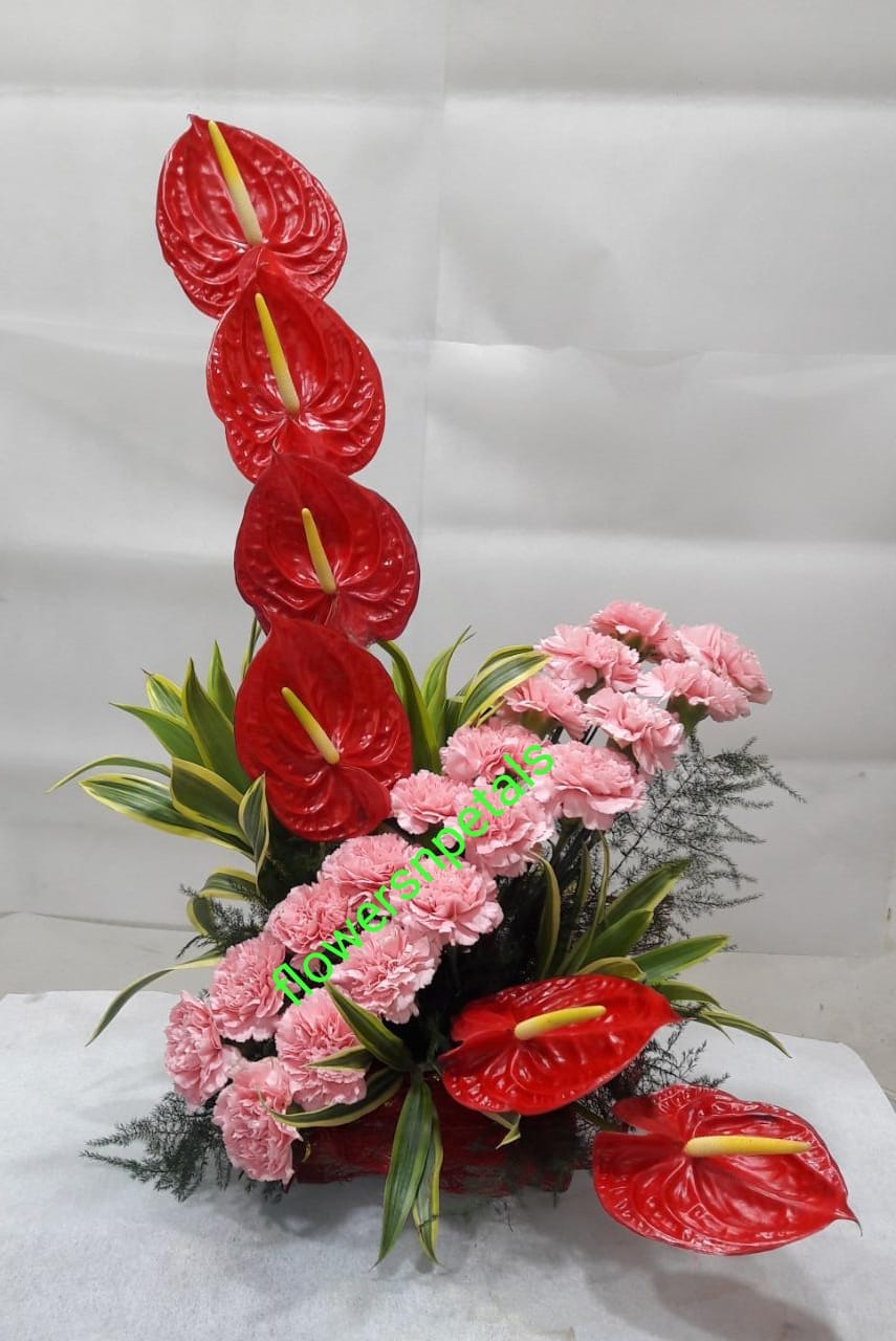 6 Anthurium 20 Pink carnation In one sided Arrangement