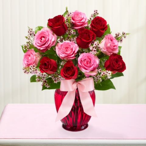 12 Red and Pink Roses in a Vase